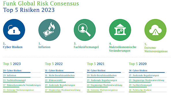 Die Risikolandschaft für Unternehmen hat sich in den letzten zwölf Monaten stark verändert. Trotz regem Infektionsgeschehen ist die Pandemie bzw. das Krankheitsrisiko wieder in den Hintergrund gerückt. Dafür führt nun die Inflation mit dem Dauerbrenner Cyber-Risiken die Rangliste der Top 5 des Funk Global Risk Consensus 2023 an. Der Ukraine-Krieg und die Konjunkturprogramme der Regierungen als Reaktion auf den wirtschaftlichen Abschwung während und nach der Pandemie hinterlassen deutliche Spuren in der Risikoeinschätzung von Unternehmen. Zurück in den Top 5 ist auch der Fachkräftemangel.